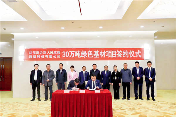 5月9日上午,包頭市達(dá)茂旗人民政府與通威股份有限公司舉行30萬(wàn)噸綠色基材項(xiàng)目簽約儀式。包頭市政府副市長(zhǎng)雷殿軍,達(dá)茂旗委副書(shū)記、旗長(zhǎng)石鐘琴,副旗長(zhǎng)王志勇、巴潤(rùn)工業(yè)園區(qū)主任孫日清,通威股份副總裁、永祥股份總經(jīng)理李斌,永祥股份戰(zhàn)略發(fā)展總監(jiān)丁曉科,內(nèi)蒙綠色基材項(xiàng)目負(fù)責(zé)人杜亦軍等領(lǐng)導(dǎo)出席簽約儀式。