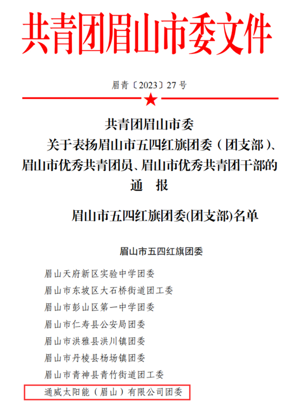 為充分發(fā)揮示范引領(lǐng)作用,激勵(lì)眉山市各團(tuán)組織踔厲奮發(fā)、創(chuàng)先爭優(yōu),5月4日,共青團(tuán)眉山市委對(duì)眉山市五四紅旗團(tuán)委(團(tuán)支部)、優(yōu)秀共青團(tuán)員、優(yōu)秀共青團(tuán)干部進(jìn)行通報(bào)表彰,通威太陽能眉山基地團(tuán)委喜獲“眉山市五四紅旗團(tuán)委”榮譽(yù)稱號(hào)。