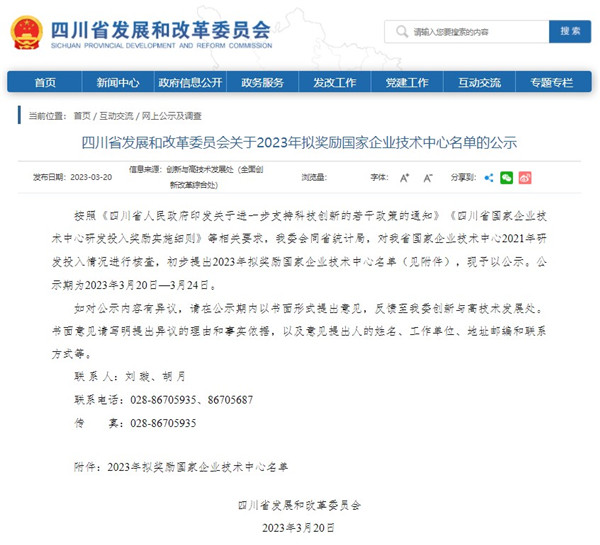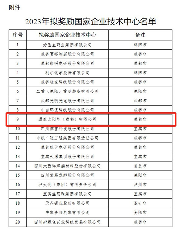 3月20日,四川省發(fā)改委公示了2023年擬獎勵國家企業(yè)技術中心名單,通威太陽能雙流基地國家企業(yè)技術中心榮列其中。