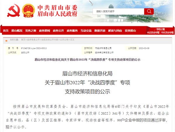 為深入貫徹落實(shí)市第五次黨代會(huì)、市委五屆二次全會(huì)精神,加快推動(dòng)工業(yè)提升,支持工業(yè)企業(yè)開足馬力抓生產(chǎn)搶進(jìn)度,眉山市發(fā)展和改革委員會(huì)、眉山市經(jīng)濟(jì)和信息化局等6部門聯(lián)合印發(fā)《眉山市2022年“決戰(zhàn)四季度”專項(xiàng)支持政策的通知》(眉市發(fā)改綜〔2022〕341號(hào));眉山市經(jīng)濟(jì)和信息化局、市財(cái)政局同步印發(fā)《關(guān)于做好2022年度加快“1+3”產(chǎn)業(yè)綠色低碳高質(zhì)量發(fā)展支持政策項(xiàng)目征集工作的通知》(眉經(jīng)信發(fā)〔2023〕5號(hào))。