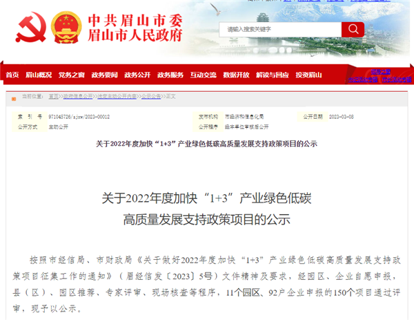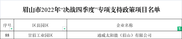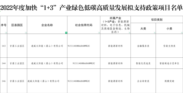 3月中旬,中共眉山市委市政府官方網(wǎng)站公示完成了《關(guān)于2022年度加快“1+3”產(chǎn)業(yè)綠色低碳高質(zhì)量發(fā)展支持政策項(xiàng)目名單》及《眉山市2022年“決戰(zhàn)四季度”專項(xiàng)支持政策項(xiàng)目名單》,通威太陽(yáng)能眉山基地經(jīng)自主申報(bào),縣(區(qū))及園區(qū)推薦、專家評(píng)審、現(xiàn)場(chǎng)核查等程序,成功榮列以上名單,在“智能化改造、企業(yè)培育、金融服務(wù)、增產(chǎn)增效”等方面獲得相關(guān)政策支持。