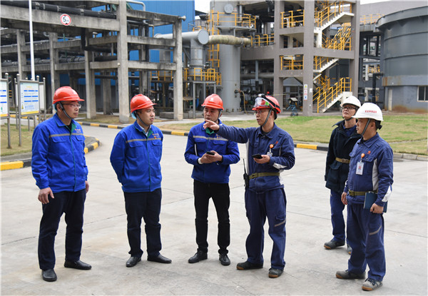 張紅東主任和張玉標董事長一行分別對公司離子膜電解工序、淡鹽水濃縮工序、高鹽廢水技改項目及PVC裝置進行參觀,柳總和李總分別對公司生產(chǎn)工藝和安全管理進行介紹。考察組一行對公司離子膜電解投入使用以來電解消耗的平穩(wěn)狀態(tài)及高鹽廢水的處理再回收利用技術給予高度評價。