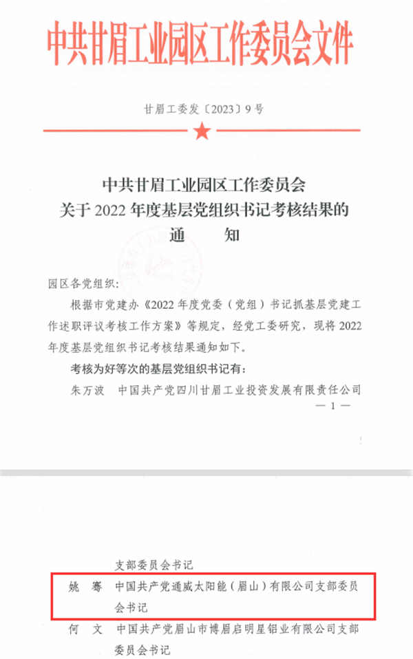 近日,通威太陽能眉山基地黨支部書記、總經理助理姚騫被評為“2022年度甘眉工業園區優秀基層黨組織書記,對其過去一年在黨建發展、團隊管理所付出的努力與取得成果給予認可與肯定。