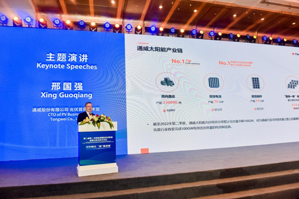 邢國強博士表示,“雙碳”戰略的實施,充分展現了中國在國際舞臺上的氣候領導力和大國擔當。實現“雙碳”目標,將引發需求、生產、技術、文化等社會方方面面的系統變革。在通往碳中和的多種技術路線中,太陽能光伏技術是解決更多能源需求與更少碳排放的最佳解決方案,是能源系統從清潔到低碳轉型的重要支撐。通威太陽能是全球光伏行業首家累計出貨量突破100GW的太陽能電池企業,100GW電池,可年生產清潔電力1387億度,減少二氧化碳排放量1.31億噸,減少二氧化硫排放量1.4萬噸,相當于種植森林71萬公頃。這一項項數據有力彰顯了通威的企業精神、企業擔當、企業情懷,交出了一份亮眼的“綠色答卷”。