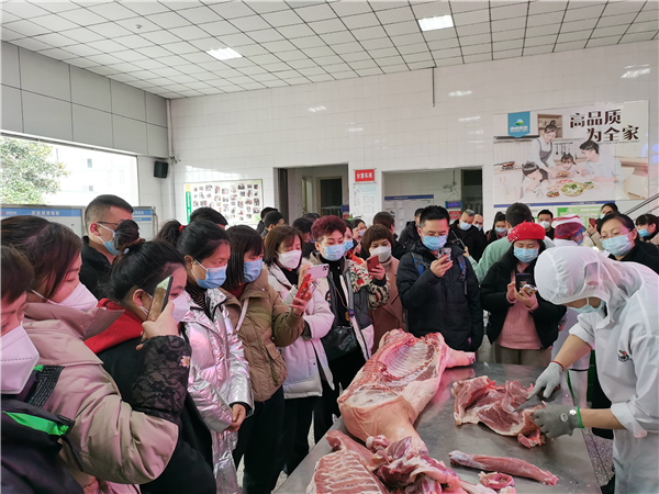 紅旗連鎖領導一行先后參觀了新太豐和春源食品兩家公司的生產現場,且在春源生產大廳現場全程觀摩白條分割,通過現場觀摩了解了門店產品分割的質量、標準以及產品損耗。