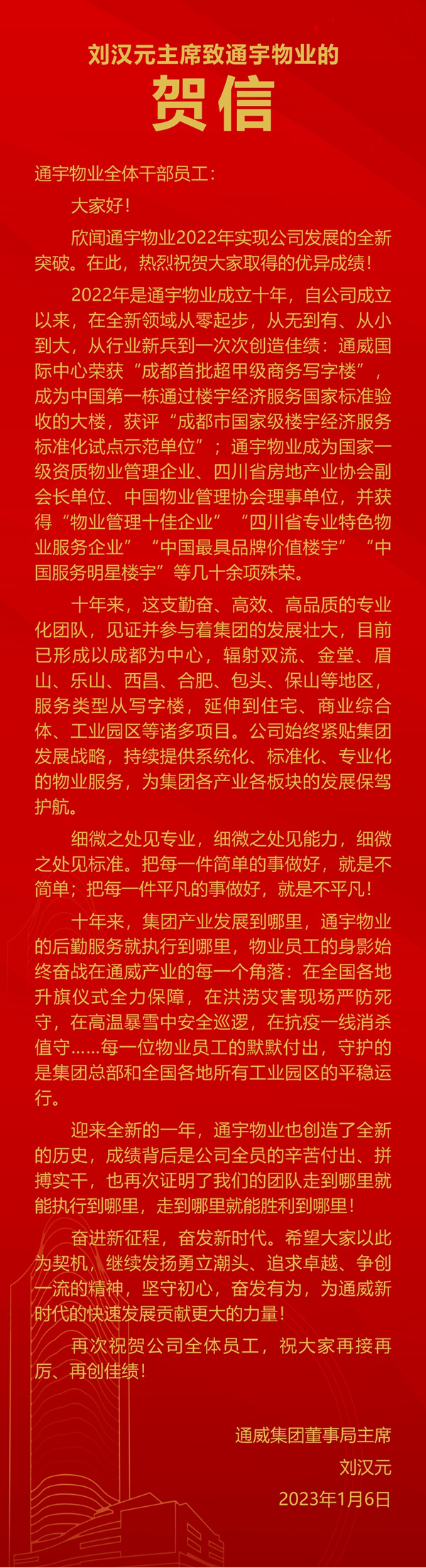 通威集團董事局劉漢元主席致通宇物業的賀信