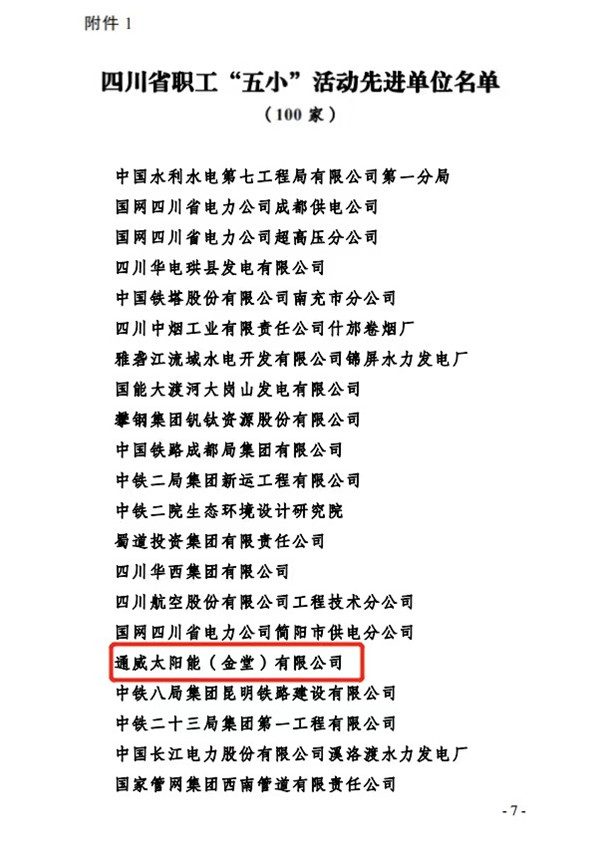 通威太陽能金堂基地榮獲四川省職工“五小”活動先進集體榮譽稱號