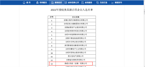近日,安徽省市場監督管理局開展了2022年度皖美品牌示范企業培育、評價工作,通威太陽能(安徽)有限公司成功入選2022年度皖美品牌示范企業名單。