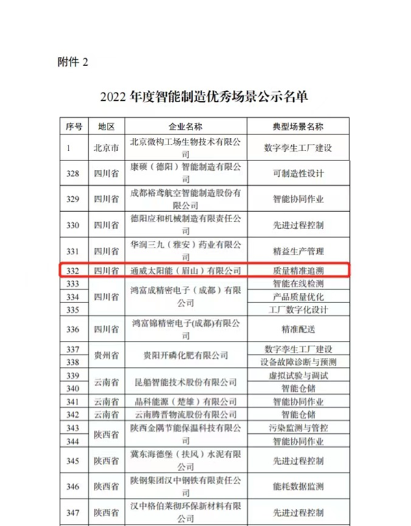 近日,國家工業和信息化部網站公示了關于2022年度智能制造示范工廠揭榜單位和優秀場景名單,通威太陽能眉山基地入列名單并順利完成公示。