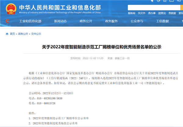 2022年度智能制造示范工廠揭榜單位和優秀場景名單