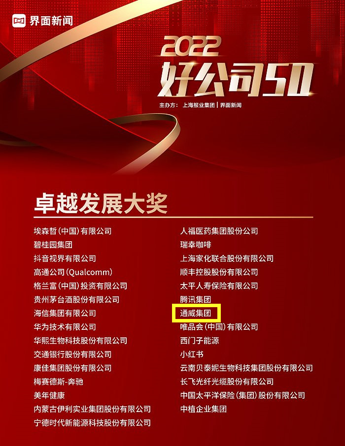 次日,在第五屆界面財經年會上,正式公布了2022“年度超級CEO”及“好公司50”等榜單。憑借持續創新以及在綠色發展方面突出的表現,通威集團榮獲2022“好公司50”卓越發展大獎。通威股份董事長、CEO謝毅榮膺2022年度超級CEO殊榮。