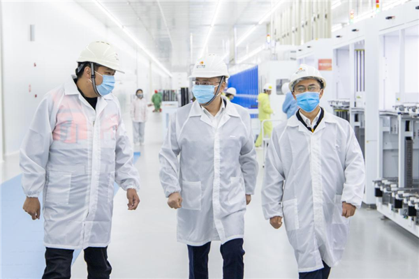 在三期項目施工現場,周華總首先對工程進度進行詳細詢問,同時深入三期車間現場對8.5GW智能高效N型車間運行情況進行檢查,并詳細了解了疫情反復期間各部門工作任務進展、疫情防控開展等相關工作情況。
