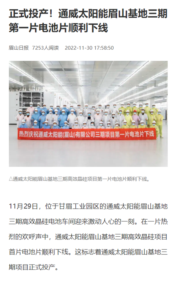 11月30日,《眉山日報》發(fā)表題為“正式投產!通威太陽能眉山基地三期第一片電池片順利下線”的報道,在報道中聚焦通威太陽能眉山基地三期項目正式投產。