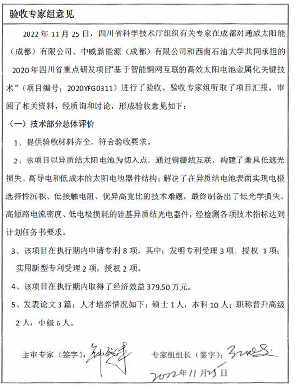 11月25日,四川省科學(xué)技術(shù)廳組織專家組對通威太陽能雙流基地承擔(dān)的“四川省重點研發(fā)項目”進(jìn)行驗收并順利通過。