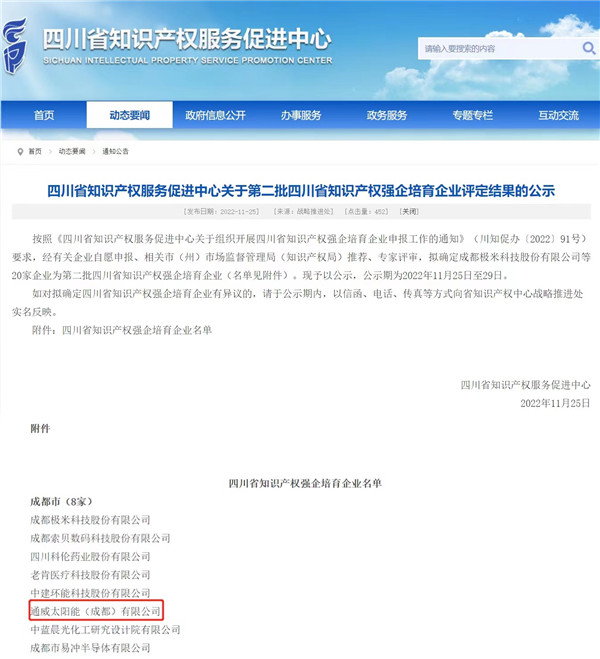 11月25日,四川省知識(shí)產(chǎn)權(quán)服務(wù)促進(jìn)中心發(fā)布《關(guān)于第二批四川省知識(shí)產(chǎn)權(quán)強(qiáng)企培育企業(yè)評(píng)定結(jié)果的公示》,通威太陽(yáng)能雙流基地憑借高質(zhì)高效的知識(shí)產(chǎn)權(quán)創(chuàng)造、運(yùn)用、保護(hù)及管理等優(yōu)勢(shì)成功入圍,成為成都市本次入選的8家企業(yè)之一。