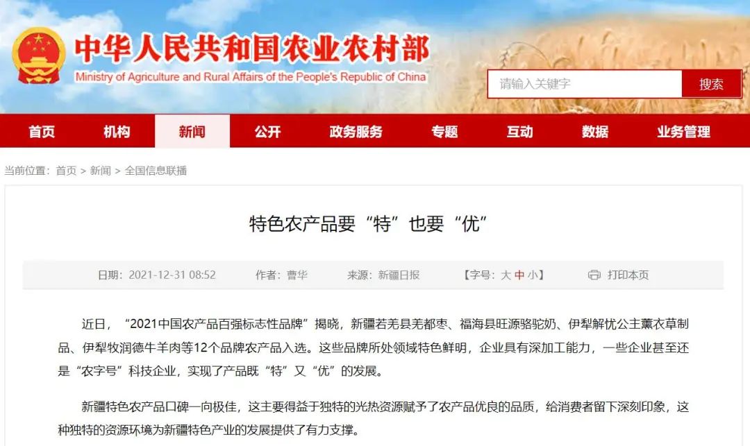 農業農村部門戶網站轉載報道百強標志性品牌助力新疆農產品既“特”又“優”