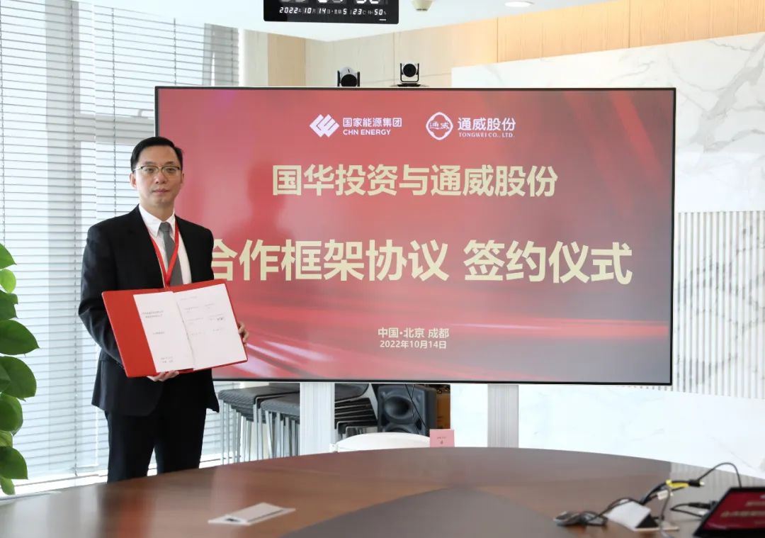10月14日,國華投資與通威股份合作框架協議簽約儀式順利舉行。國華能源投資有限公司黨委書記、董事長劉小奇,黨委委員、副總經理劉瑞生,國華投資黨委委員、副總經理李大鈞 ,通威股份董事長、CEO謝毅,通威股份總裁助理劉舒琪,光伏商務部組件全球營銷總經理邱新等出席并通過視頻會議共同見證。