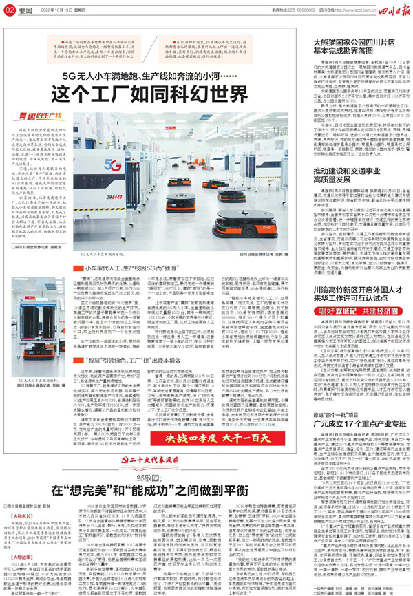 1013日,《四川日報》發表題為這個工廠如同科幻世界的文章,聚焦通威太陽能金堂基地智能制造及5G技術應用新場景