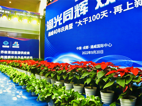 期間,隨處可見的通威40年主題元素裝置、展現(xiàn)通威發(fā)展的時光隧道、一盆盆鮮艷多姿的景觀花卉,將大會現(xiàn)場裝扮一新。通威藍(lán)與喜慶紅,交相輝映,現(xiàn)場處處洋溢著喜慶氛圍,熱情迎接各位領(lǐng)導(dǎo)嘉賓,共慶通威40年華誕。