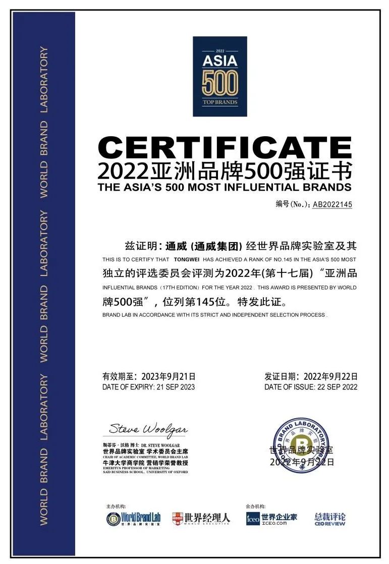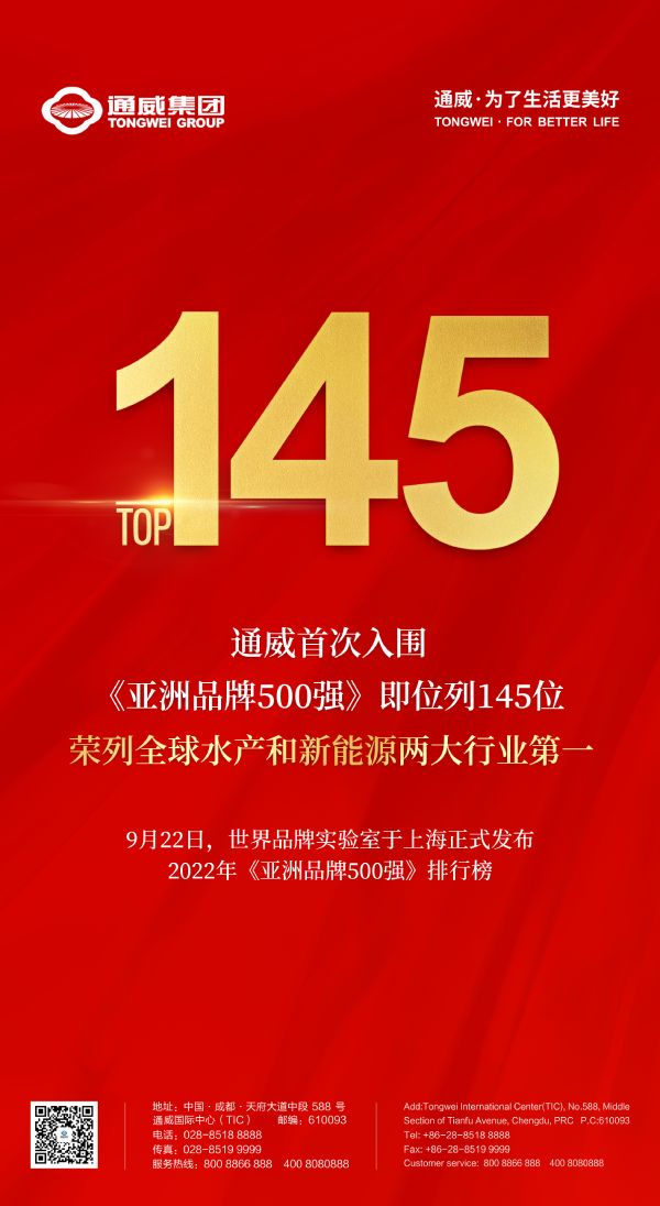 在以40年為新起點,再出發(fā)、再奮進的重要時刻,通威再登國際權威榜單。9月22日,由世界品牌實驗室(World Brand Lab)主辦的“亞洲品牌大會”在上海召開,會上隆重發(fā)布了2022年《亞洲品牌500強》排行榜。通威首次入圍《亞洲品牌500強》即位列145位,榮列全球水產(chǎn)和新能源兩大行業(yè)第一,彰顯了公司穩(wěn)健的發(fā)展態(tài)勢和強勁的品牌實力。