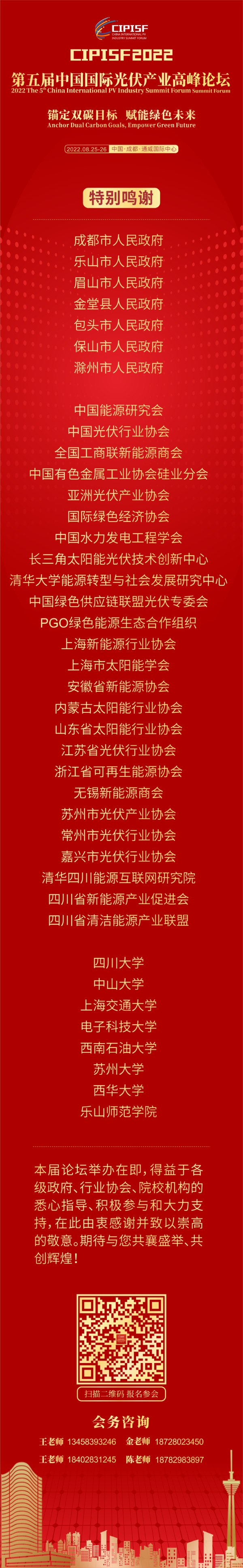政企聯動,共譜新篇。光伏產業的發展,離不開各級政府部門的關心與支持。第五屆中國國際光伏產業高峰論壇將邀請四川、內蒙古、云南、安徽等?。ㄊ?、區),成都、樂山、眉山、金堂等近10個地方政府主要領導參加本次論壇,探討光伏政策趨勢及產業規劃布局,促進光伏產業高質量發展,助推能源革命,實現青山綠水、藍天白云的中國夢!