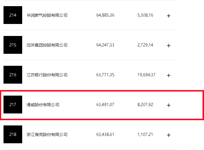 今年500家上榜中國500強的上市公司總營業收入達到62萬億元人民幣,和上年上榜公司相比,增長約17.4%;凈利潤達到了4.7萬億元,較上年增長約9.2%。和上一年的榜單相比,今年上榜公司的年營收門檻接近228億元,相比去年近174億元的門檻提升31%。去年中國GDP突破110萬億元,今年榜上500家上市公司的收入總和達62萬億元,超過了中國當年GDP的一半。憑借近635億元的營收,通威排名榜單第217名,較上一年度提升了39位。