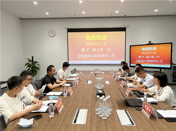 7月27日,眉山市總工會副主席戴宇一行蒞臨通威太陽能眉山基地指導調研職工勞動競賽工作,通威太陽能眉山基地工會主席高宇攜工會委員代表熱情接待并陪同座談。