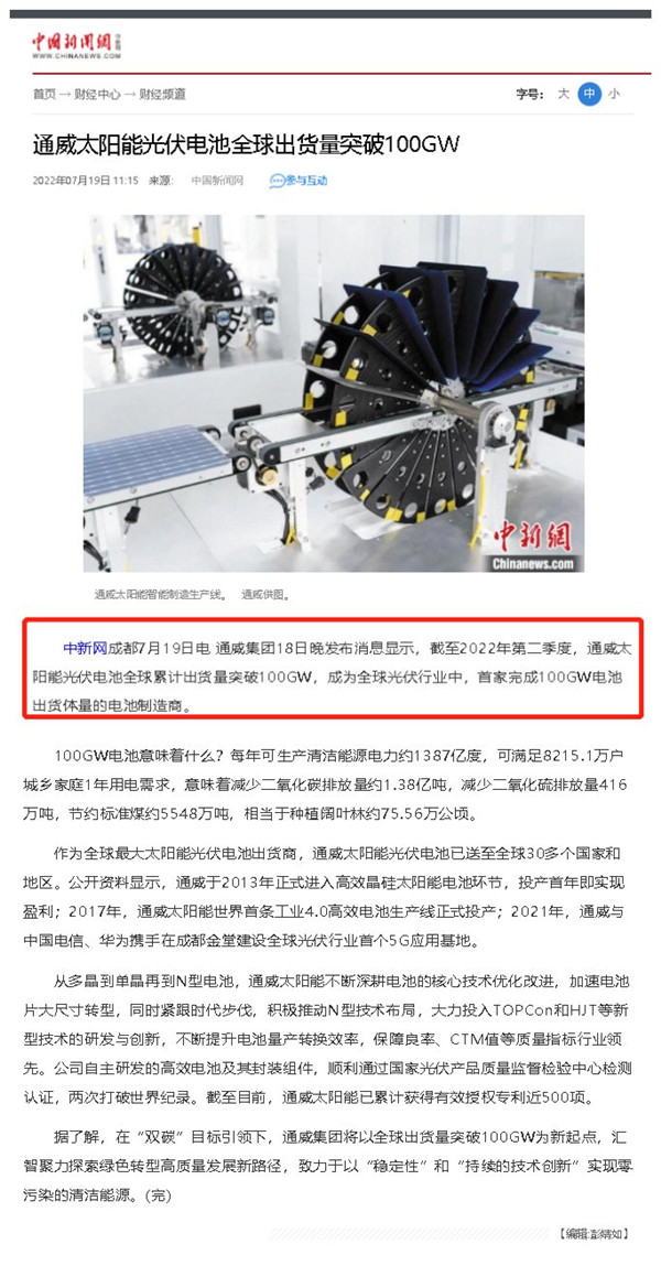 中國新聞網聚焦通威太陽能光伏電池全球出貨量突破100GW