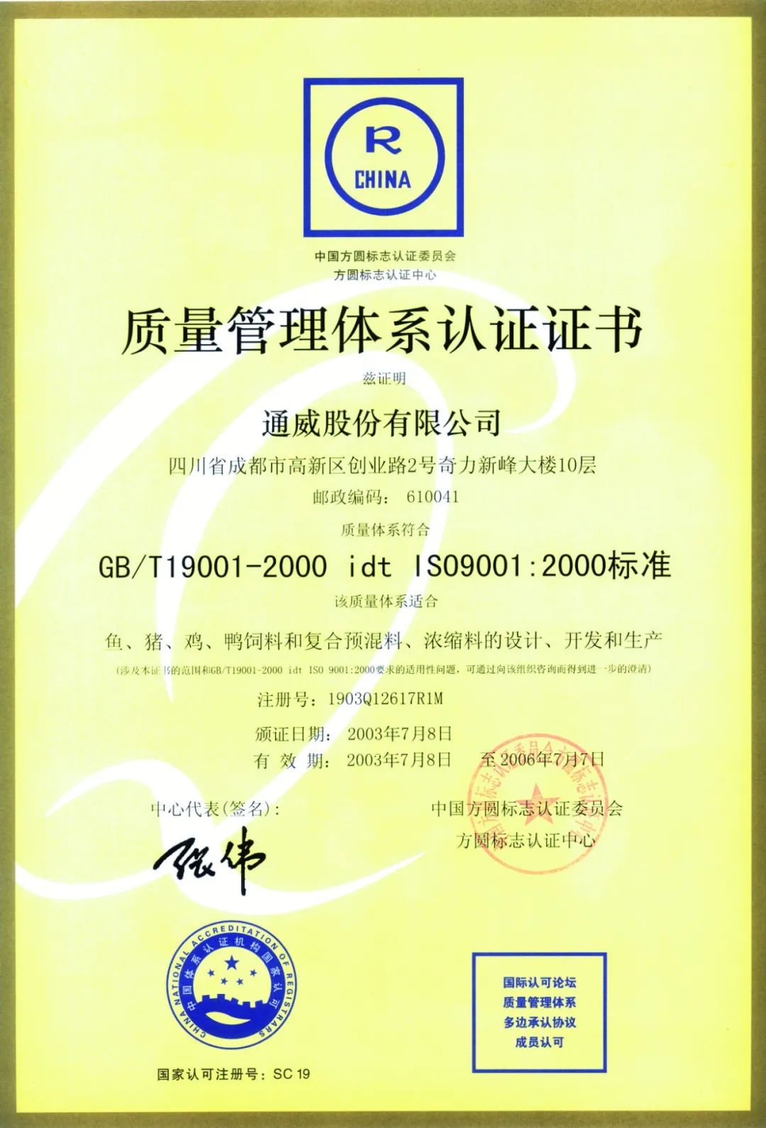 ▲1997年,通威集團(tuán)在中國飼料行業(yè)首家通過ISO—9002質(zhì)量體系認(rèn)證和產(chǎn)品方圓認(rèn)證