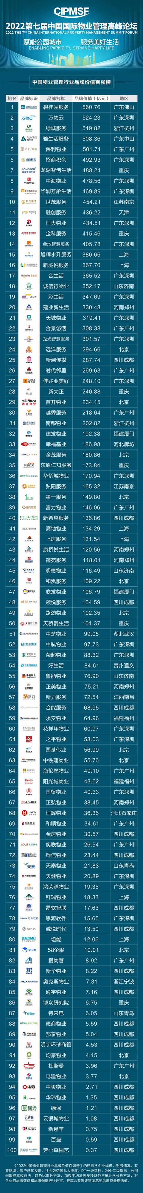中國物業管理行業品牌價值百強榜