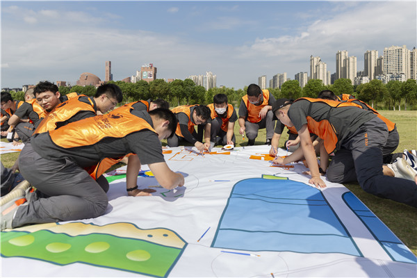 在各基地活動現場,50平方的巨幅納斯卡畫卷被等分成五個部分由百名員工分組進行繪制,既明確分工,又相互協作,他們在潔白的畫卷上用藍色、橙色、黃色、綠色、紅色……勾勒出一幅幅通威畫卷,或以智能化車間、花園式工廠的繪制展現通威太陽能在集團的引領下向著“光伏改變世界”企業愿景,聚勢聚焦、做專做精,為實現“碳中和”目標而貢獻智慧和力量的真實寫照;或以漁光一體畫面展示出“通威,為了生活更美好”的美好愿景,向集團40年崢嶸歲月與雙主業發展的良好勢頭致敬;亦或以“青山”登高,綠水“揚帆”來表現全體通威人通力合作,為了“綠水青山”偉大愿景,為了生活更美好而不懈努力的奮斗之志。