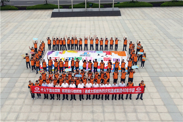 千人千面繪藍圖,砥礪前行續輝煌。五個主題的巨幅畫卷在員工們的共同協助下,在郎朗祝福聲中一一組合舒展開來,畫卷上落下的每一筆是通威人對通威四十年一路拼搏的回望,是對集團綠色農業與綠色能源雙輪驅動的禮贊,更是對未來通威將繼續勇立潮頭、琸厲奮發的美好展望。通威太陽能全體員工將繼續發揚“通力合作,威力無窮”的團結協作與實干精神,用心工作,用智慧工作,用只爭朝夕的精神工作,在集團的引領下在新起點新征程揚帆起航,再續華章!