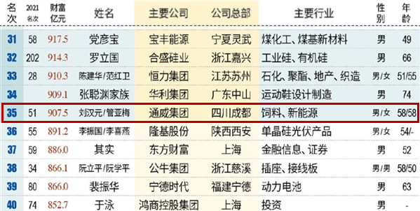 5月12日,全球知名權威商業雜志《福布斯》發布了2022年全球企業2000強榜單,憑借高質量穩健發展和持續向好的業績,通威股份榮耀上榜。次日,2022新財富500富人榜隆重揭曉,十一屆全國政協常委、全國人大代表、通威集團董事局劉漢元主席,通威集團管亞梅董事長榮列榜單第35位,較去年上升16位。