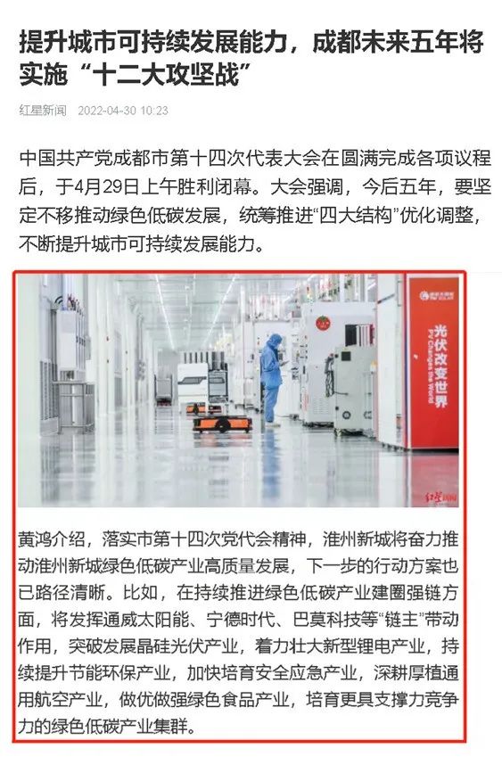 4月30日至5月1日,人民網、成都商報、紅星新聞等主流媒體先后以“成都未來五年將實施‘十二大攻堅戰’”為題,聚焦通威太陽能助力綠色低碳產業建圈強鏈。