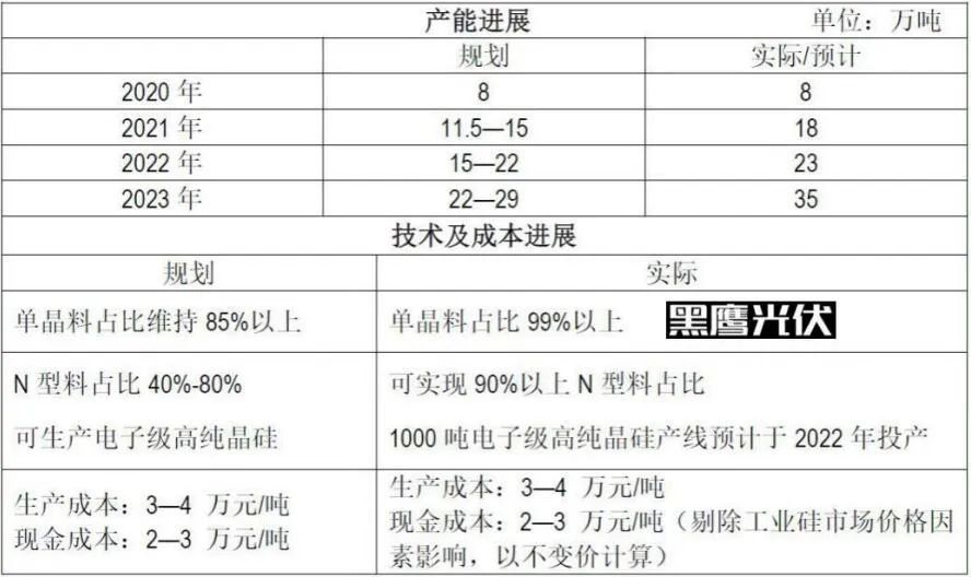 根據當時公告,通威中期發展規劃明確:高純晶硅業務的累計產能目標分別為2020年8萬噸,2021年11.5至15萬噸,2022年15至22萬噸,2023年22至29萬噸。其中,單晶料占比85%以上,N型料占比40%-80%,生產成本3-4萬元/噸,現金成本2-3萬元/噸,相比彼時的產能成本進一步大幅下降。