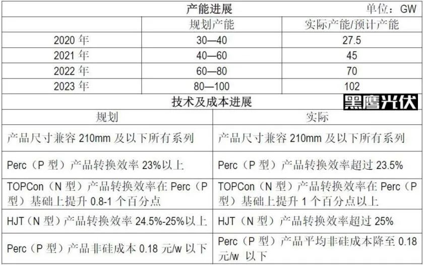 具體到太陽能電池業務:根據公司實際施情況2022年底公司已累計建成45GW太陽能電池產能,順利完成2020—2021年階段性目標;目前在建的通合二期7.5GW、金堂二期 8GW及其他擬建項目預計將分別于2022年、2023年投產,屆時公司太陽能電池規模達到102GW,綜合目前技術、成本指標情況 綜合目前技術、成本指標情況,公司將超額完成四年中期規劃目標,具體情況如下表: