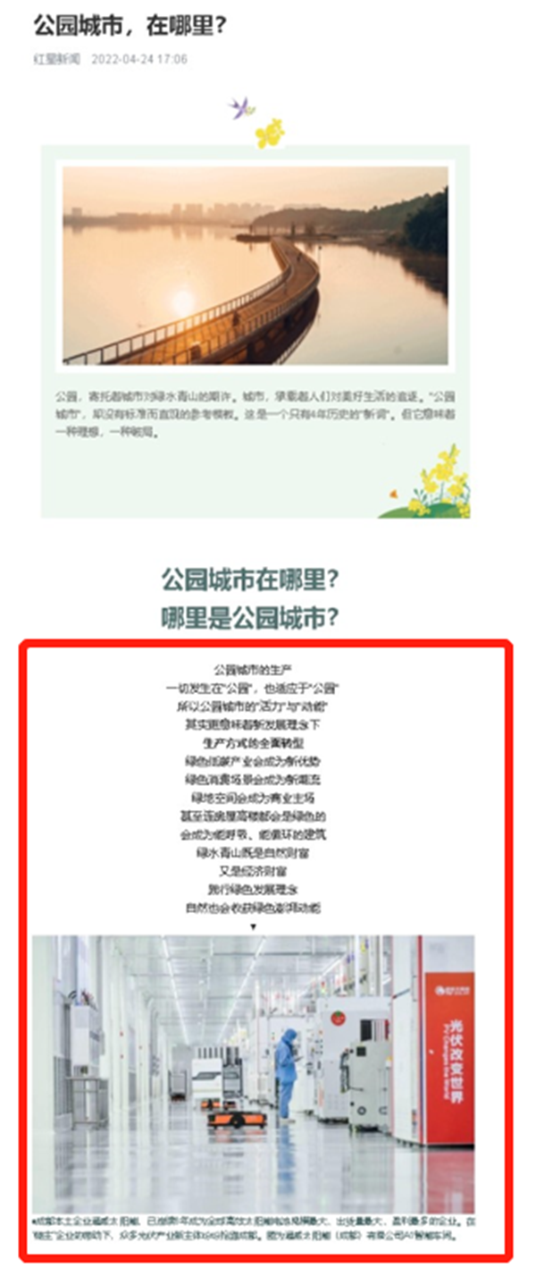 同時,紅星新聞在系列報道中重點聚焦通威太陽能綠色發(fā)展,報道中提到,“成都本土企業(yè)通威太陽能,已連續(xù)6年成為全球高效太陽能電池規(guī)模最大、出貨量最大、盈利最多的企業(yè)。在“鏈主”企業(yè)的帶動下,眾多光伏產(chǎn)業(yè)新主體紛紛搶灘成都?!眻蟮缹νㄍ柲芊e極踐行綠色發(fā)展工作成效及發(fā)揮鏈主企業(yè)帶動作用表示高度認(rèn)可。