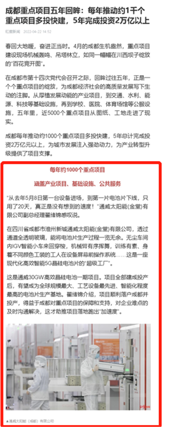 4月22日至26日,川觀新聞、紅星新聞等媒體聚焦通威太陽能,對通威太陽能項目建設(shè)、綠色發(fā)展、產(chǎn)值增長進(jìn)行報道。