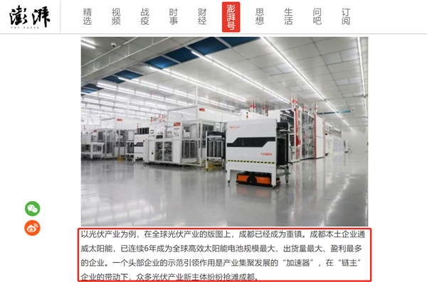 成都日報、澎湃新聞指出,“成都本土企業通威太陽能,已連續6年成為全球高效太陽能電池規模最大、盈利最多的企業。一個頭部企業的示范引領作用是產業集聚發展的“加速器”,在“鏈主”企業的帶動下,眾多光伏產業新主體紛紛搶灘成都。”報道對通威太陽能在成都建圈強鏈行動中,所持續發揮的頭部示范引領作用給予高度評價。