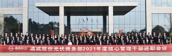 1月11日,通威股份光伏商務部2021年度核心管理干部述職會在通威太陽能雙流基地圓滿舉行。十一屆全國政協常委、全國人大代表、通威集團董事局劉漢元主席出席并作重要指示。通威集團禚玉嬌總裁,通威股份董事長謝毅、監事會主席鄧三、光伏首席技術官邢國強、人力資源總監易繼成出席會議。通威股份光伏商務部管理團隊作2021年度述職報告。永祥股份、通威新能源相關領導干部視頻參會。