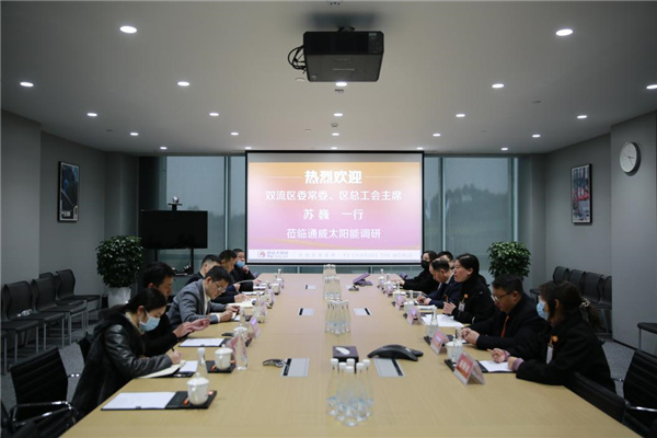 1月5日,成都市雙流區委常委、區總工會主席蘇巍蒞臨通威太陽能雙流基地調研,雙流區總工會黨組書記、常務副主席羅鋼,黃甲街道黨工委書記尹宏波,雙流區總工會黨組成員、副主席陳薈斯等人陪同,通威太陽能副總經理周華熱情接待,通威太陽能雙流基地工會主席羅蘭、財務信息部相關負責人及工會委員代表陪同座談。