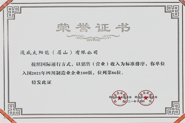 據悉,該榜單是四川省企業聯合會按照國際通行方式,以2020年銷售(營業)收入為標準,經有關機構審定,發布百強企業排序。本次獲獎是通威太陽能雙流基地連續三年榮登榜單,而通威太陽能眉山基地是建成投產后首次入圍并獲得殊榮。通威太陽能兩個基地同時獲獎,既是對企業產品競爭力的極大肯定,是公司踐行高質量發展,加快培育發展新動能,扎實做強做優爭創一流的體現,亦是企業主動承擔社會責任,積極助力雙碳目標實現的決心和實力的彰顯。