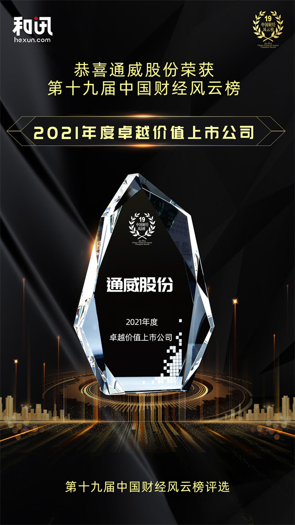 12月16日,由和訊網主辦的“第十九屆中國財經風云榜”上市公司和金融機構頒獎盛典在上海舉辦。通威榮獲“2021年度品牌卓越企業”“2021年度卓越價值上市公司”兩項殊榮。