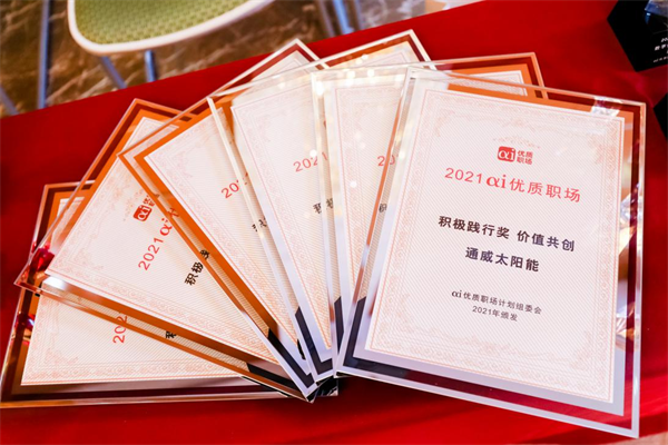 通威太陽能此次榮獲“2021αi優質職場積極踐行獎”,不僅是深耕雇主品牌建設的成果展示,也是職場品牌具有廣泛影響力的有力證明。公司完善的人才選用、培養、激勵、關愛機制,貫穿員工職業發展全周期,全方位助力員工突破自我,最大化實現自身價值和職業目標,多年來,還數次榮獲“年度最佳雇主”、“中國好伯樂”、“大學生最喜愛雇主”等殊榮。未來,公司將進一步打造員工與企業“健康共行、成長共贏、財富共享、價值共享”的優質職場環境,樹立優質職場榜樣品牌,引導社會、企業、員工共建和諧、共贏的理想職場生態。