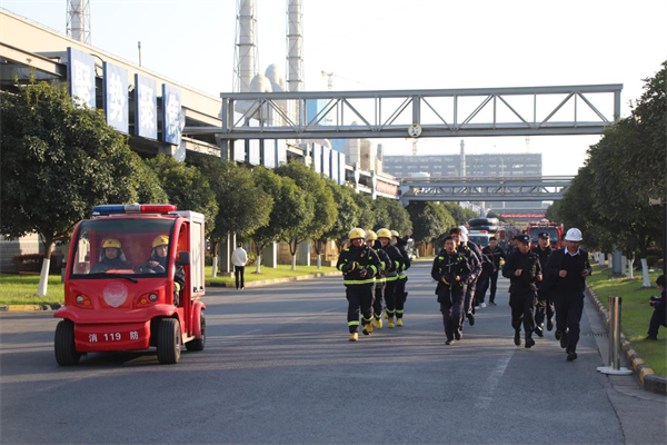 演練以“時間跨越、場景位移”的方式,以點帶面展現工貿行業易發頻發的“廠房火災、有限空間窒息、危化品泄漏”事故。演練模擬公司P4車間在檢修時突發火災,造成6人被困,其中2人不同程度受傷,在處置過程中,又相繼發生有限空間作業人員中毒窒息事故及液氨鋼瓶泄漏事故,共設置事故發生與信息報告、響應啟動與先期處置、事態升級與應急聯動、應急終止與后期處置等4個環節。