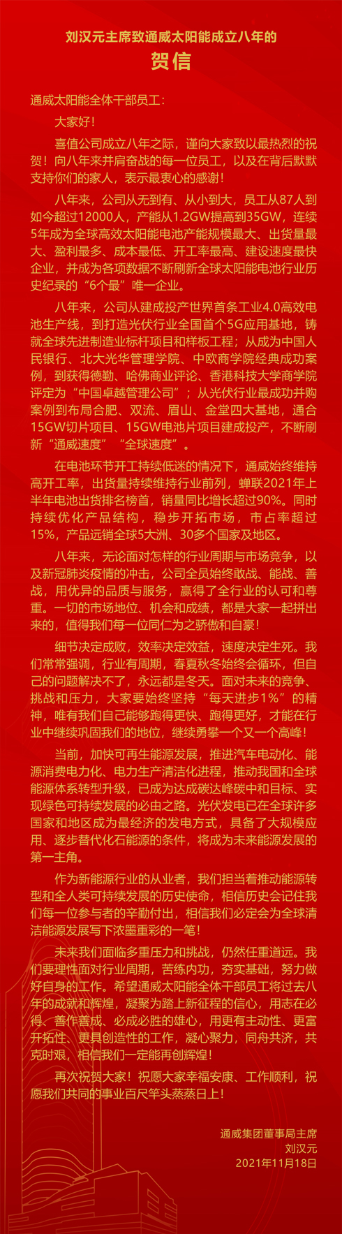 劉漢元主席致通威太陽能成立八年的賀信
