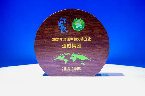 與此同時,碳中和先鋒企業年度案例(2021)正式發布,通威集團與騰訊、美團等九家企業共同入選“2021年度碳中和先鋒企業”年度案例,并榮獲“2021年度碳中和先鋒企業”稱號。通威集團作為我國唯一一家新能源企業入選該案例并獲獎,展現了社會各界對于通威多年來始終堅持綠色低碳發展,積極助力并打造“碳達峰、碳中和”“通威樣本”的高度認可。