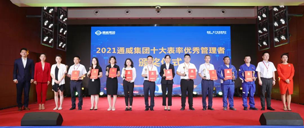 經過各體系、板塊推薦及評選出的十位優秀個人、十位優秀管理者、十個優秀團隊,大會對善作為勇擔當的優秀通威人代表進行了表彰。其中,通威新能源業務二部總經理楊勇、業務二部工程技術部結構設計工程師張霞分別榮獲“通威集團十大表率優秀管理者”和“通威集團十大表率優秀員工”殊榮,通威新能源科技(北京)有限公司開發部榮獲“通威集團十大表率優秀團隊”殊榮。這些優秀的表率,為大家樹立出清晰又真實的榜樣形象,而這些榜樣就是通威文化精神的現實載體。讓我們向榜樣致敬、向榜樣學習。