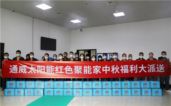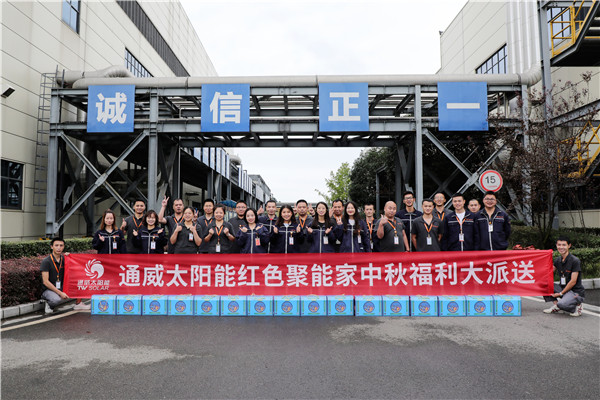 中秋將至,月滿情濃,為弘揚(yáng)傳統(tǒng)文化,感謝全體員工為公司發(fā)展付出的辛勤努力,9月16日,通威太陽(yáng)能合肥、雙流、眉山、金堂四基地組織開(kāi)展“紅色聚能家中秋福利大派送”活動(dòng),為廣大職工送去節(jié)日祝福。