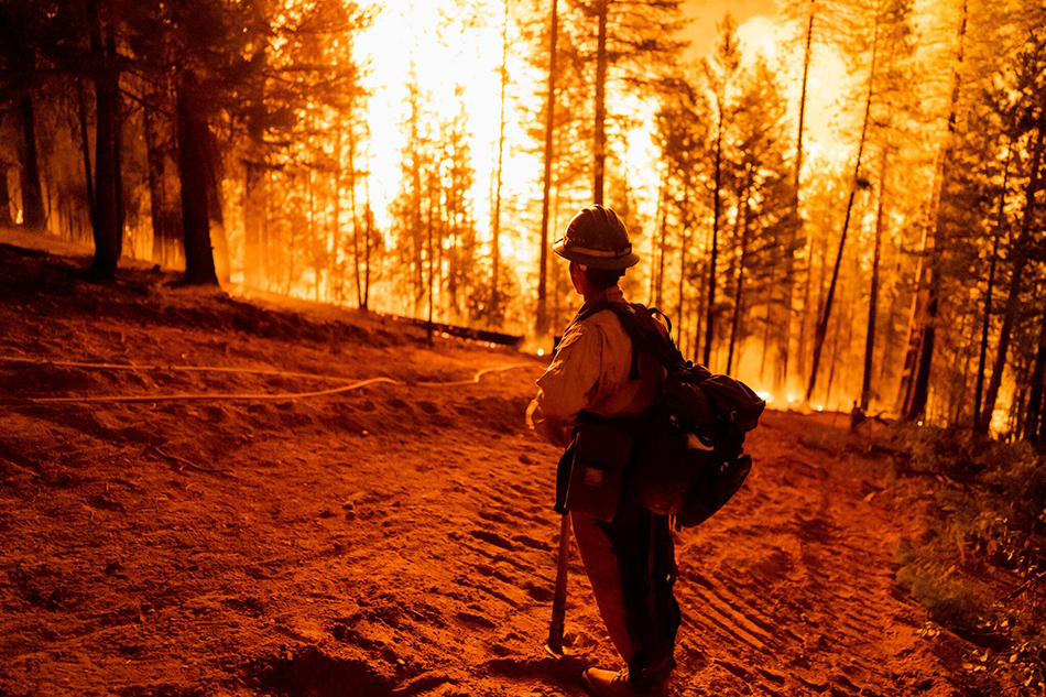 一名消防員在加利福尼亞州昆西附近的迪克西火災控制區內監測火災